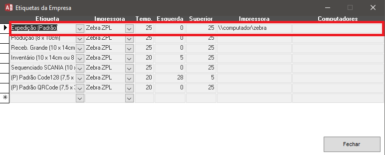 Depois basta selecionar a etiqueta, o modelo da impressora, os campos de temperatura e margens (esquerda e superior) serão preenchidos automaticamente. No entanto, são editáveis e podem ser configurados de acordo com sua necessidade, o campo de “Impressora” deve ser informado o endereço do compartilhamento fornecido pelo seu TI, caso impressora seja utilizada somente por alguns computadores específicos eles podem ser informados com campo “Computadores”.