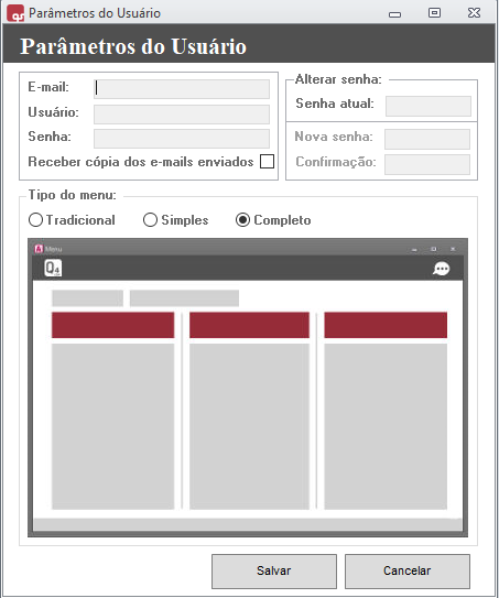 1. Em Segurança > Funções > Parâmetros do Usuário, você pode alterar seu nome de usuário, e-mail e senha que integra ao sistema, e ainda pode alterar a senha de acesso ao Q4.